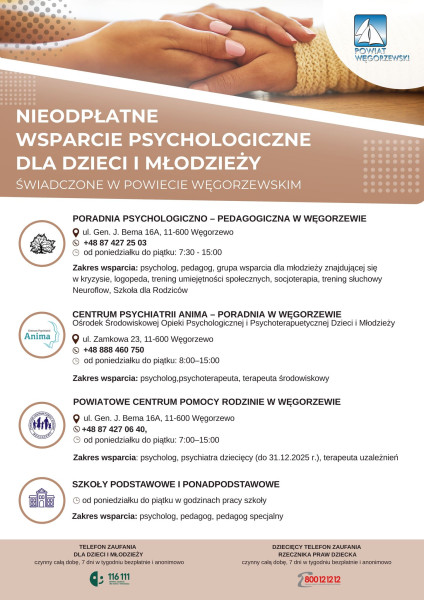 Informujemy, że na terenie powiatu węgorzewskiego dostępne jest bezpłatne wsparcie psychologiczne i terapeutyczne dla dzieci i młodzieży.