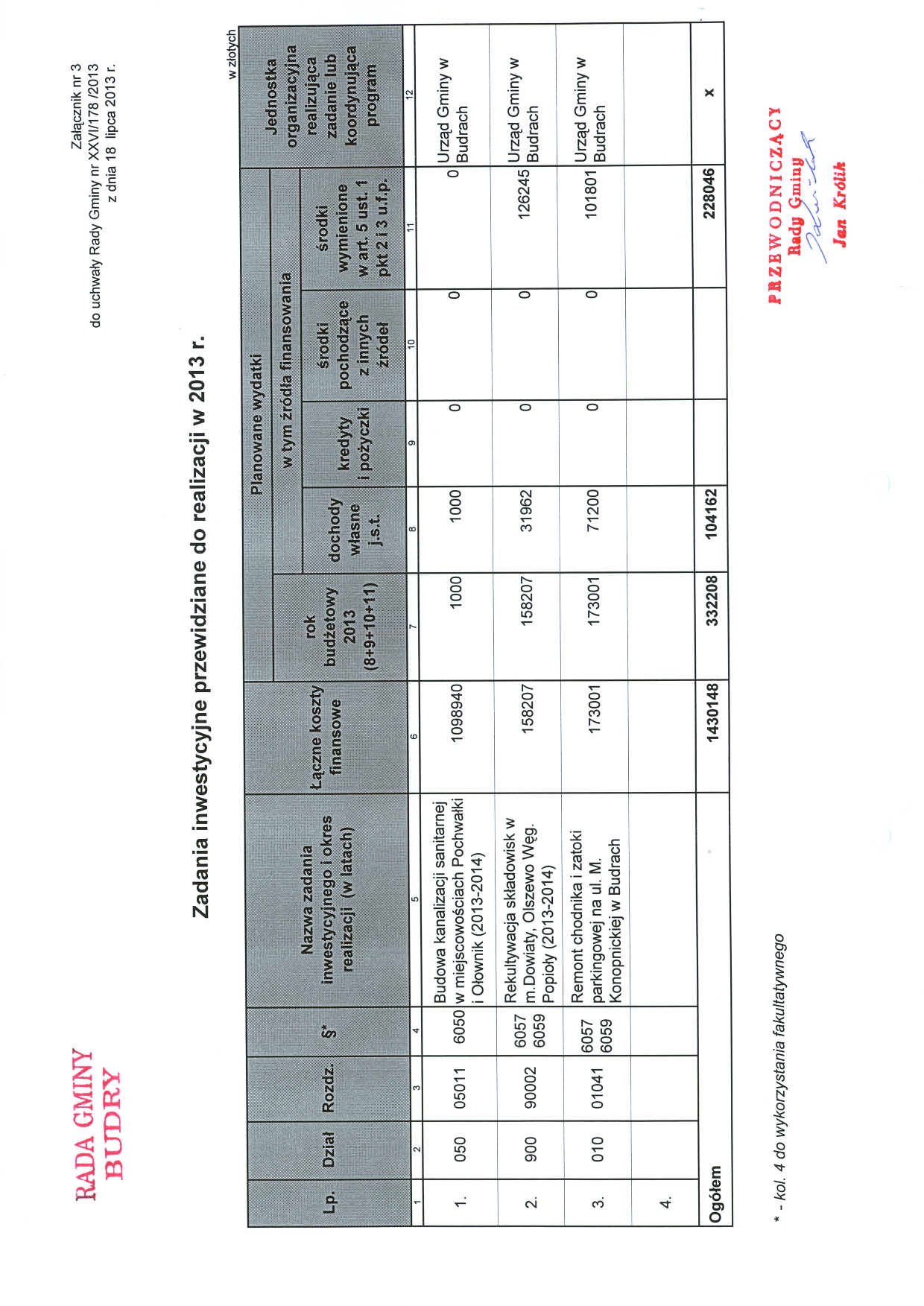 Ustala się nowe brzmienie załącznika nr 3 do Uchwały nr XXI/141/2012 Rady Gminy z dnia 20 grudnia 2012 r. "Zadania inwestycyjne przewidziane do realizacji w 2013 r." zgodnie z załącznikiem nr 3.
