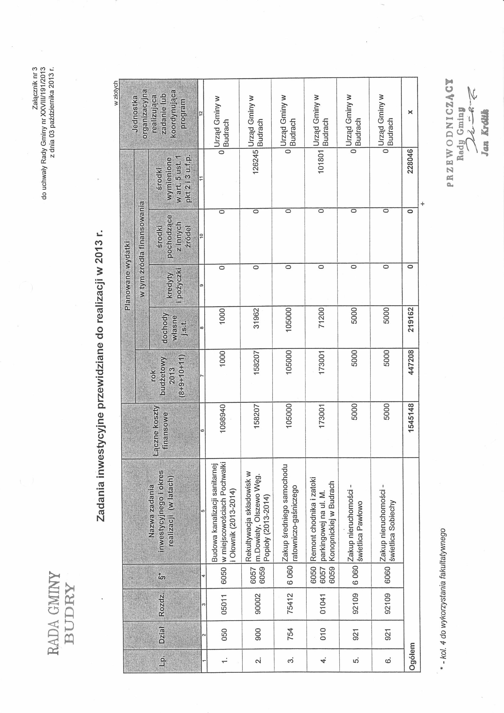 Ustala się nowe brzmienie załącznika nr 3 do Uchwały Rady Gminy nr XXI/141/2012 z dnia 20 grudnia 2012 r. "Zadania inwestycyjne przewidziane do realizacji w 2013 r." zgodnie z załącznikiem nr 3.