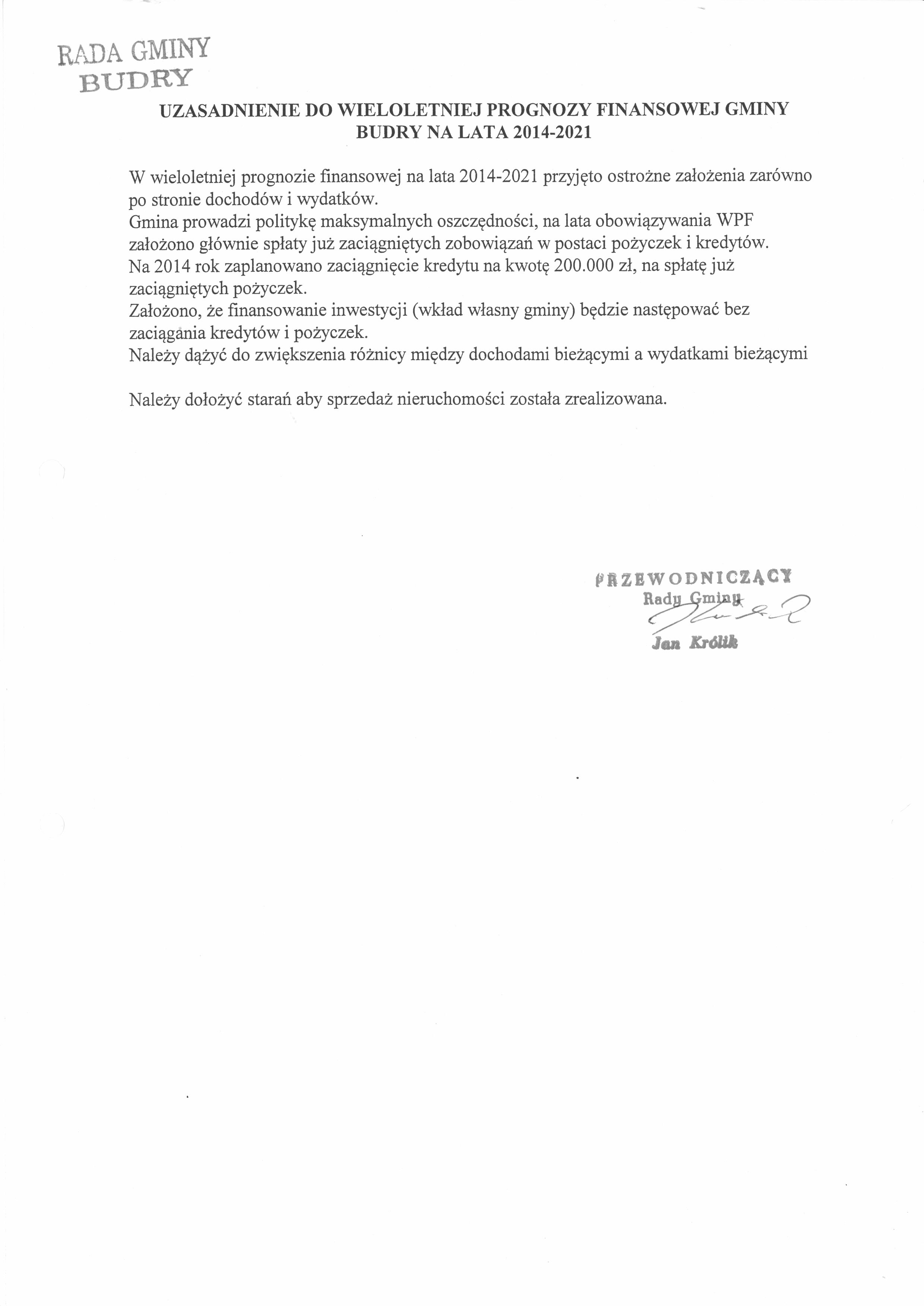 uchwalenia Wieloletniej Prognozie Finansowej Gminy Budry na lata 2014– 2021